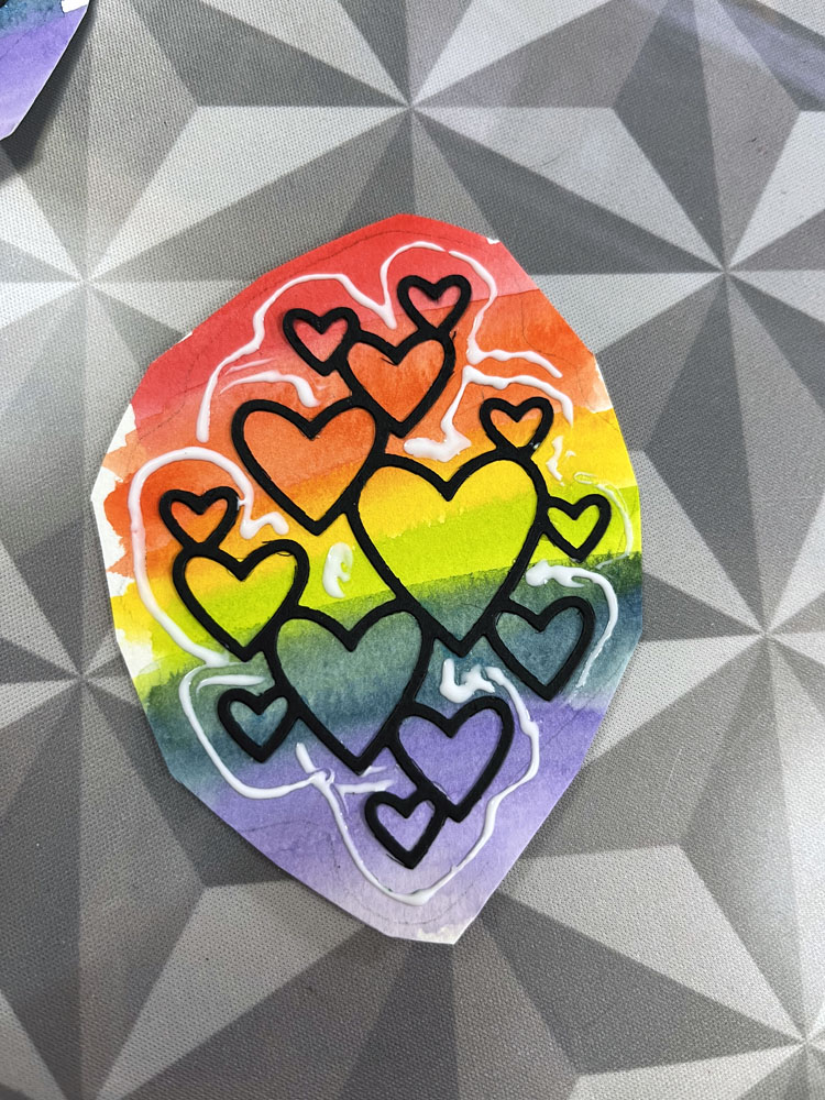 To get around that, I used the die again on black cardstock, saved the 196 black hearts for a rainy day1, and glued the black outlines to the rainbow paintings.